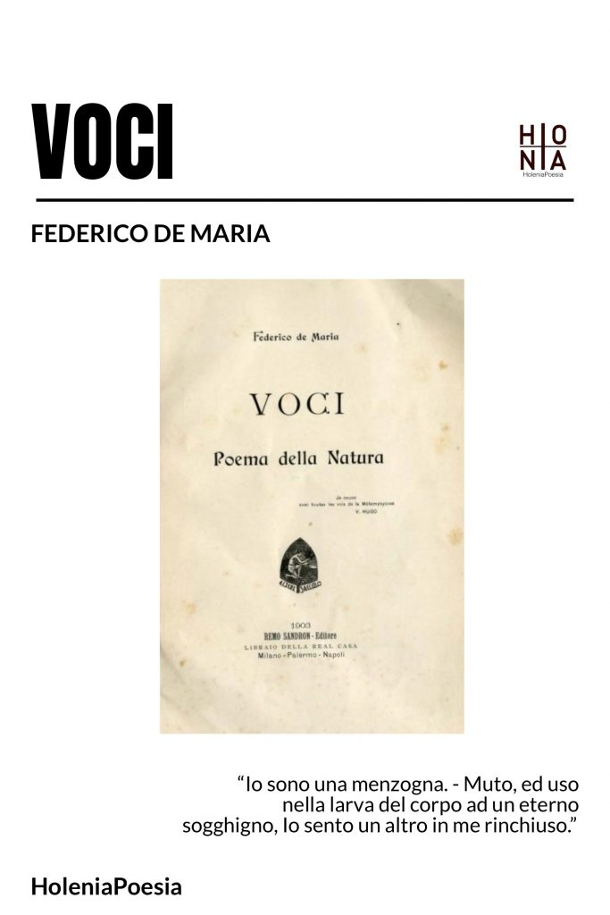 “Federico De Maria tratta anche i metri con orgoglioso sprezzo, non privo di ardimento cavalleresco e quasi voluttuoso… Parecchie di quelle “Voci” continuano per qualche tempo a risonare nell’orecchio, come il tentativo quasi onomatopeico di “La Canzone dell’Usignuolo” che ha preceduto i gridi, i trilli, i zirli, i sibili, di cui oggi usa e abusa un gran poeta, il Pascoli; come l’ossessione di “Czolgocz”, l’assassino di MacKinley giustiziato sulla sedia elettrica, brano di poesia tragica che dà i brividi, riproducendo con terribile verità psicologica gli ultimi orrendi istanti in attesa della scintilla mortale. Innanzi tutto piace il suo atteggiamento di ribelle verso il bizantinismo dei decadenti, dei pagani di terza e di quarta mano, dei simbolisti. Egli è il poeta dell’oggi…” Luigi Capuana (1906)
