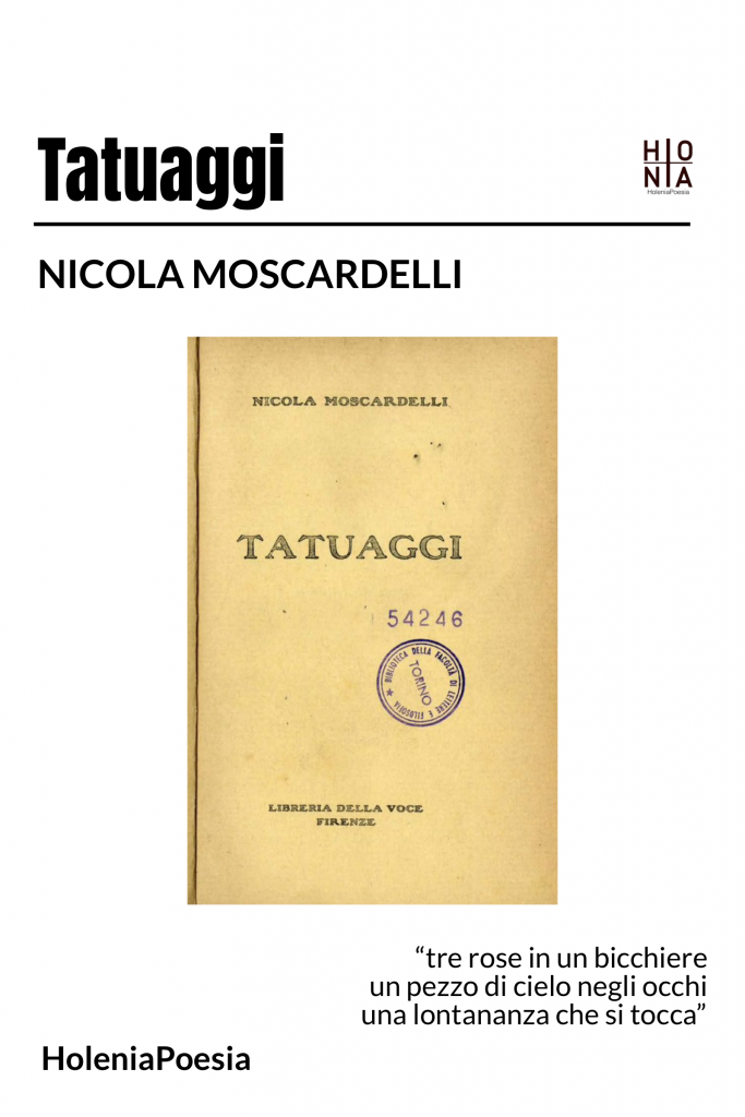“Tatuaggi” è diviso in tre sezioni, ‘Autunno’, ‘Terra e sangue’, ‘3’. A rappresentare il nucleo più solido del libro è il “diario di guerra”, ovvero la seconda parte scritta sul Carso tra maggio e ottobre del 1915. La dura esperienza del conflitto provocò in Moscardelli una cesura netta ed insanabile, così come capitò a tante voci della sua stessa generazione (basti pensare ad Ungaretti). Dalla dura disillusione, dalle cicatrici sul corpo e nello spirito, cui fa riferimento la metafora del titolo “Tatuaggi”, nasce non solo un uomo nuovo ma un nuovo e più consapevole autore. Le contraddizioni della vita sfumano; le complicazioni intellettualistiche (che gravavano sulle precedenti raccolte) svaniscono; il significato dell’esistenza è colto intuitivamente nel sentimento di appartenenza alla natura e alle sue vicende; la precarietà della vita in trincea, quando non si fa troppo soverchiante, diventa fonte di una forza positiva, quasi d’ebrezza, poiché da essa nasce l’emozione salvifica e fraterna dell’incontro con l’altro.