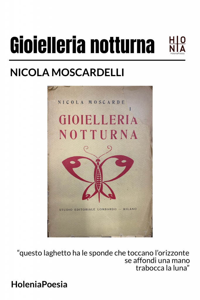 Dopo l’iniziale rifiuto di Vallecchi, Gioielleria notturna, l’opera poetica unanimamente riconosciuta come il vertice artistico di Nicola Moscardelli, vide la luce nel 1918 in sole 200 copie, per interessamento dello Studio Editoriale Lombardo. Come notò Carlo De Matteis “data la limitata tiratura”, e lo status del tutto marginale dell’editore, “la circolazione fu assai circoscritta, e paradossalmente, il libro più nuovo e personale del poeta abruzzese fu anche quello meno noto”. Gioielleria notturna, arriva dopo la fondamentale esperienza euristica ed esistenziale della rivista moscardelliana Le Pagine, dove una volta attraversate tutte le inquietudini delle avanguardie primo novecentesche, si fece avanti una rinnovata esigenza di “rappel à l’ordre” che di lì a poco avrebbe dato vita anche all’esperienza de La Ronda e alla rivalutazione della tradizione letteraria italiana.